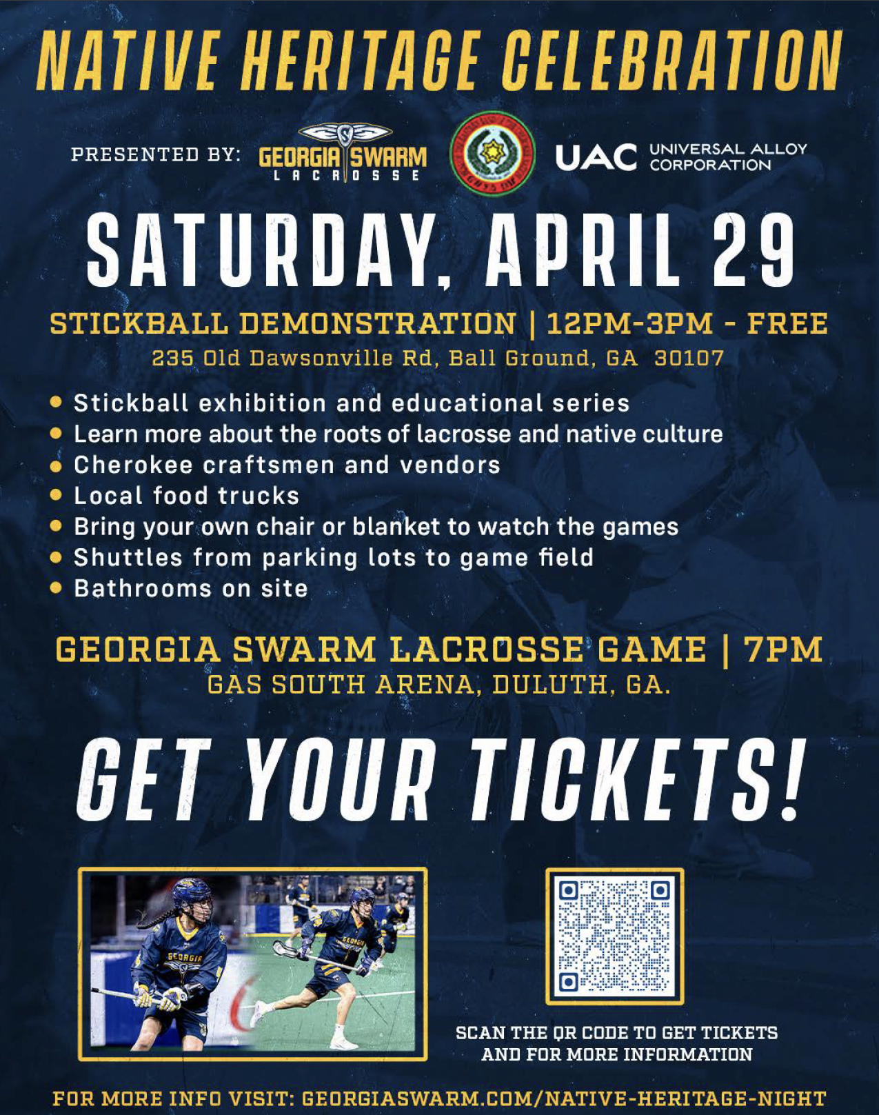 Saturday, April 29 2023, 12pm Calvin Farmer Park Seminars APRIL 29 | 12PM-3PM | BALL GROUND, GA. – FREE Cherokee Stickball Exhibition Opportunity for fans to learn Stickball and the roots of lacrosse Cherokee Craftsmen and Vendors Local Food Trucks Bring your own chair or blanket to watch the games Shuttles from parking lots to game field available for free Bathrooms on site Georgia Swarm vs. Halifax Thunderbirds game to follow at 7PM ET in Gas South Arena, Duluth, Ga Time: 12PM – 3PM Location: Calvin Farmer Park 235 Old Dawsonville Rd Ball Ground, GA 30107 SATURDAY, APRIL 29TH AT 7PM Did you know lacrosse was the first ever game played in what is now known as North America? The game was gifted to us by The Creator to drive away sickness and create positive energy. We never forget. This special game is entwined in our team’s DNA, and we always stay true to our roots. Many members of the Swarm roster share these roots, and their stories shed light on the importance of this sport in their lifelong development as people. Enjoy special pregame and halftime performances from Native groups and a night-long celebration of Indigenous People’s culture. Doors open earlier than usual this night so all fans have the chance visit the vendors who traveled from Cherokee, NC to pick up an authentic basket, original arts & crafts, or a traditional wooden lacrosse stick. Head over to Section 100 prior to faceoff for a speaker series and Q&A session lead by our Native players, Warrior Dancers, Miss Cherokees, and more! The discussion will be about Native heritage culture, the “Every Child Matters” initiative, and other cultural questions that arise. GET TICKETS HERE flyer (3.49 MB) Georgia Swarm Lacrosse https://www.georgiaswarm.com/native-heritage-night/