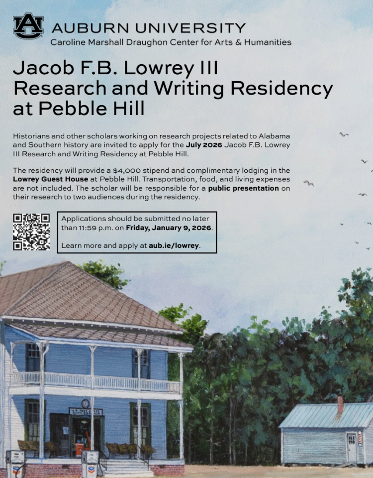Image: Historians and scholars working on research projects related to Alabama and Southern history are invited to apply for the July 2026 Jacob F. B. Lowrey III Research and Writing Residency at Pebble Hill. The residency provides a $4,000 stipend and complimentary lodging in the Lowrey Guest House at Pebble Hill. During their stay, the selected scholar will give two public presentations on their research. Transportation, food, and other living expenses are not included. Applications are due by 11:59 p.m. on Friday, January 9, 2026. Learn more and apply at aub.ie/lowrey.